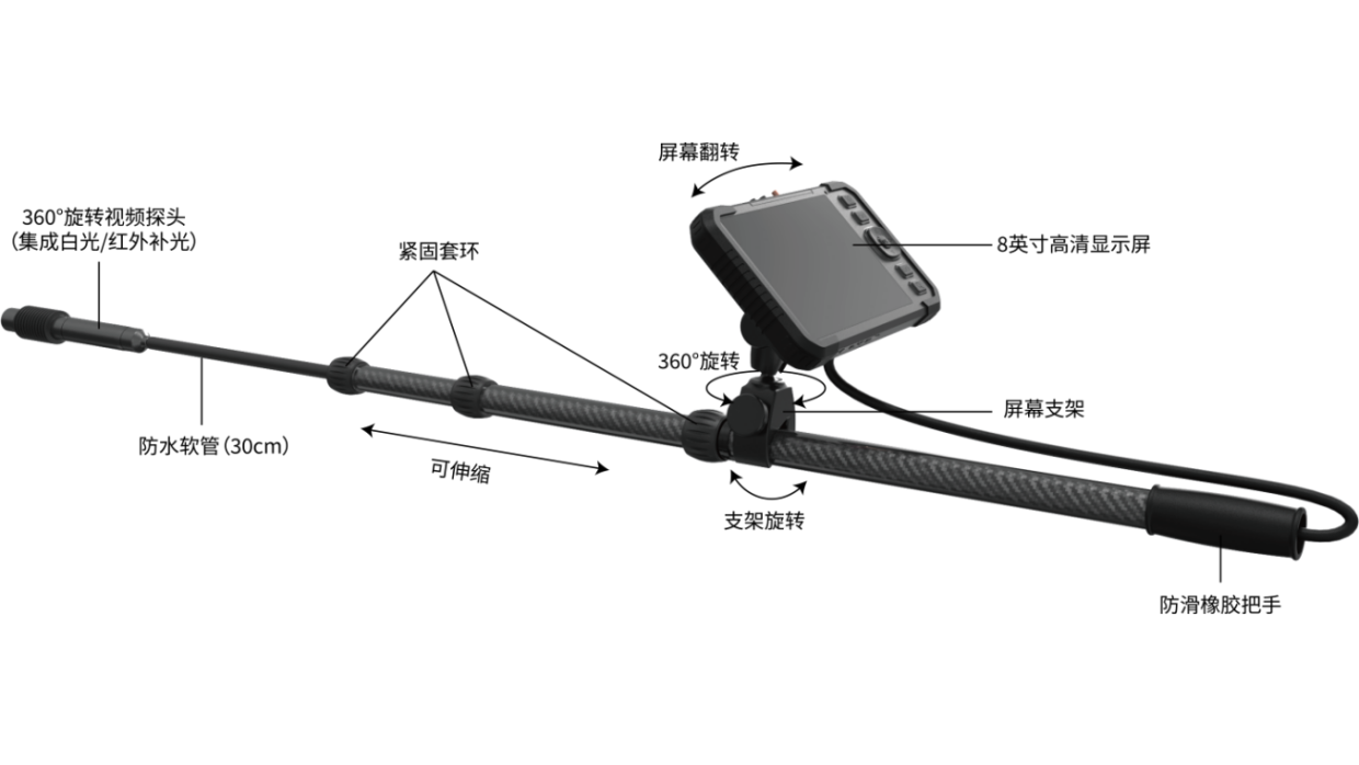 ·伸缩式探杆:探测线6 米;最短长度1米(不含软连接部分及其他突出部分),最长长度4米(含软管)。