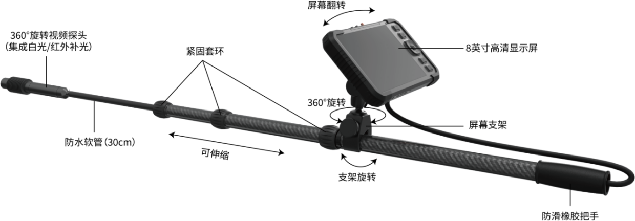 ·伸缩式探杆:探测线6 米;最短长度1米(不含软连接部分及其他突出部分),最长长度4米(含软管)。